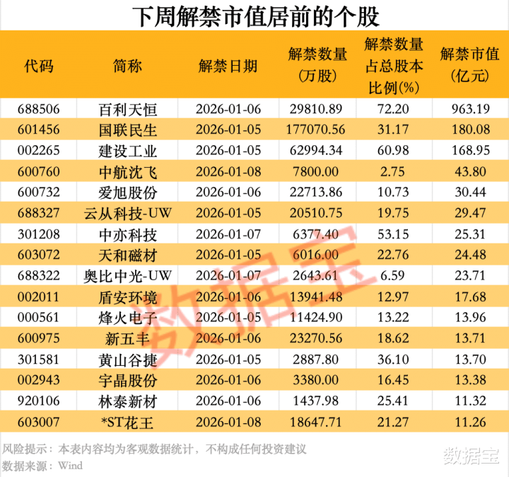 百利天恒解禁市值963.19亿元,居首。该股解禁数量为2.98亿股,占公司目前总股本的72.2%,解禁股东为公司控股股东、实际控制人朱义先生,其全部限售股均于2026年1月6日解禁。公司近日还发布了回购预案,公司拟使用自有资金或自筹资金,以集中竞价交易方式回购不超过2亿元(含)、不低于1亿元(含)的A股股份,回购价格上限为546元/股,不超过董事会决议前30个交易日均价的150%。回购股份将全部用于实施员工持股计划或股权激励,若3年内未使用完毕,将依法注销。